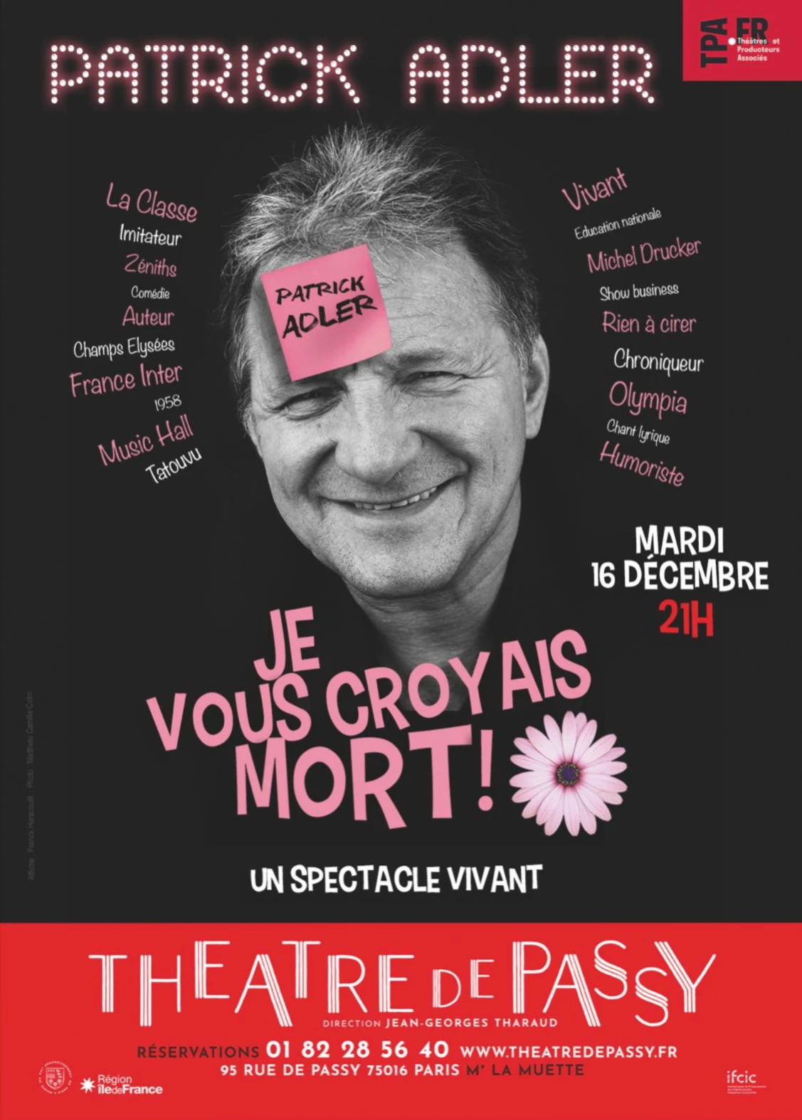 Tout aura commencé dans un train quand une dame d’un âge avancé s’avance dans la travée, puis recule, avance à nouveau, recule à nouveau …pour finalement se planter devant lui avec ces simples mots : -C’est vous ? (Réponse timide de l’intéressé ) -Oui. -C’est quoi déjà votre petit nom ? (S’engage alors un jeu de devinettes) -Vous choisissez quoi, Madame ? Je vous propose le 50/50, le vote du public à moins que vous ne préfériez appeler un ami … -Je vois pas. -Allez, je suis bon Prince…Patrick Adler La dame, qui semble vraiment bouleversée, s’exclame alors : -Mais que je suis heureuse ! Vous savez quoi ? J’étais triste… Je vous croyais mort !